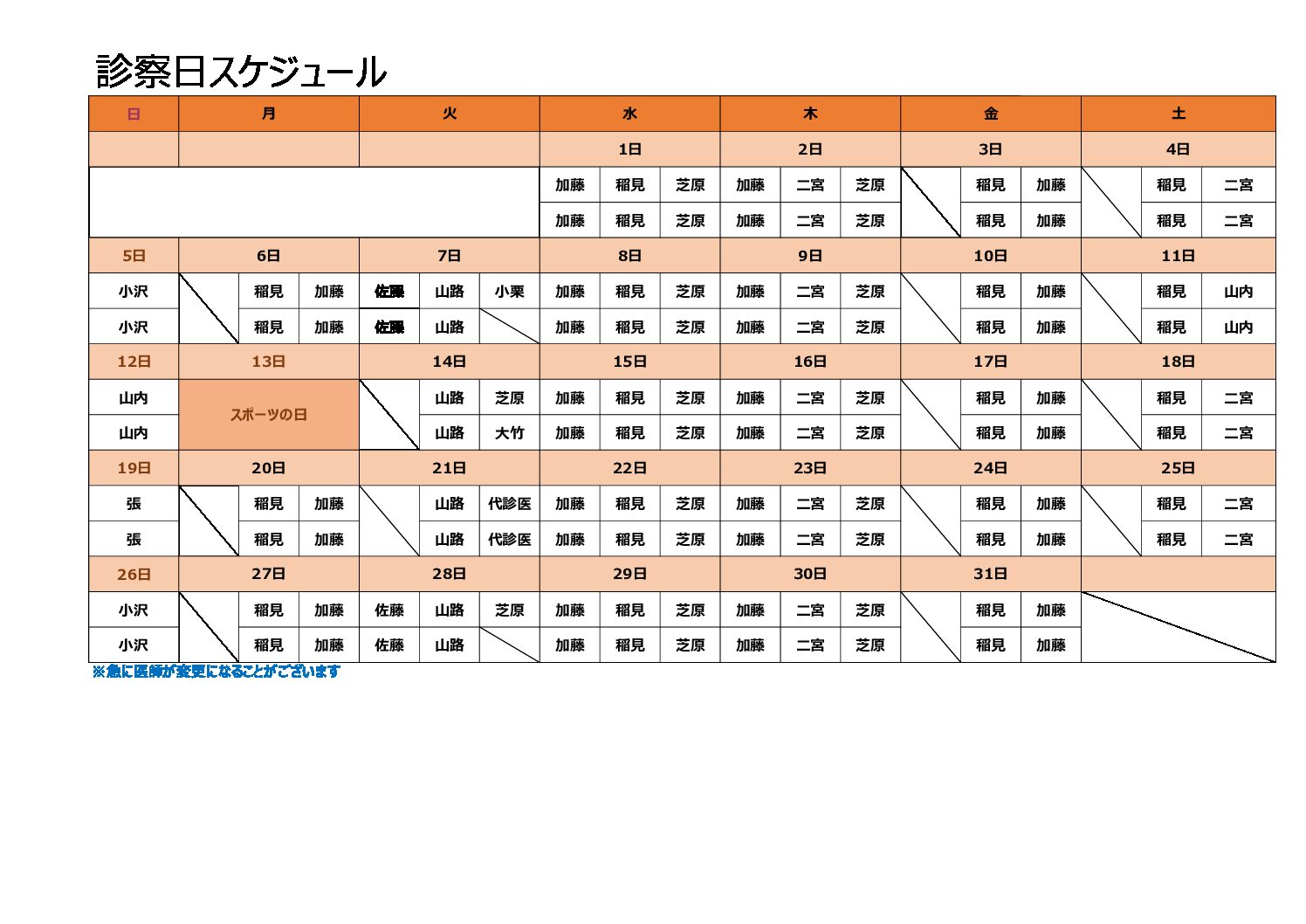 今月の担当医別の診察スケジュールをご案内しています。休診日などお間違えのないようご注意ください。